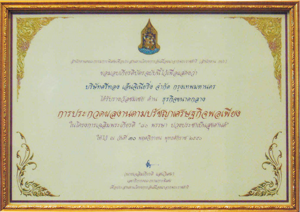 ตามที่สำนักงานคณะกรรมการพิเศษเพื่อประสานงานโครงการอันเนื่องมาจากพระราชดำริ (สำนักงาน กปร.) ได้จัดประกวดผลงานตามปรัชญาเศรษฐกิจพอเพียง ภายใต้โครงการ “๘๐ พรรษา ปวงประชาเป็นสุขศานต์” เนื่องในโอกาสมหามงคลเฉลิมพระชนมพรรษา ๘๐ พรรษา ๕ ธันวาคม ๒๕๕๐ ด้วยการให้พสกนิกรชาวไทยได้จัดส่งผลงานการปฏิบัติตามปรัชญาเศรษฐกิจพอเพียงที่นำไปประยุกต์ใช้ในการประกอบอาชีพ การดำเนินชีวิต และการบริหารธุรกิจจนประสบความสำเร็จอย่างเป็นรูปธรรมเข้าร่วมประกวด คณะกรรมการตัดสินการประกวดฯ ได้ตัดสินคัดเลือกให้บริษัท ศรีทอง เอ็นจิเนียริ่ง จำกัด ได้รับรางวัลชมเชย ด้านธุรกิจขนาดกลาง